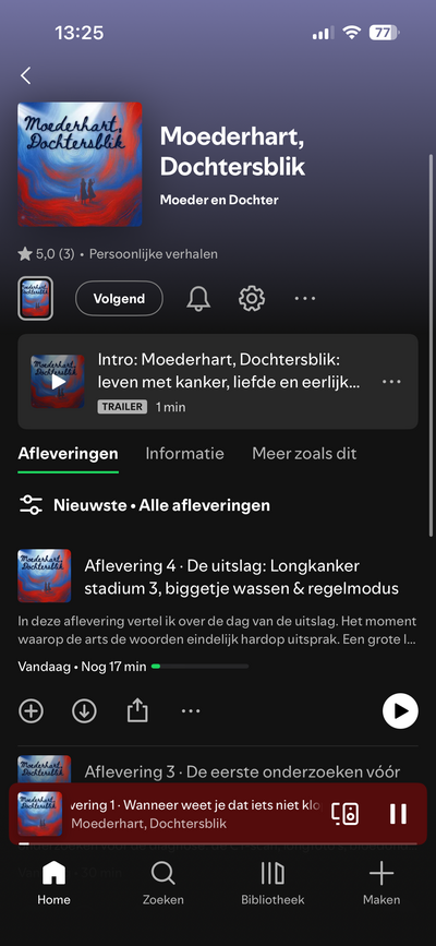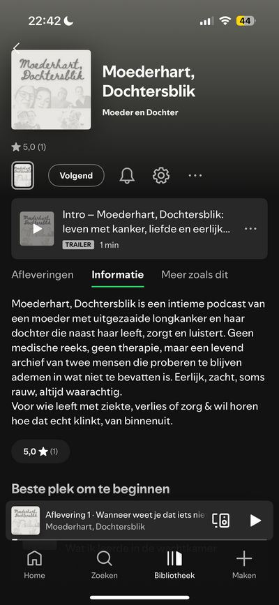 This podcast is in Dutch. Moederhart, Dochtersblik is een intieme podcast van een moeder met uitgezaaide longkanker en haar dochter die naast haar leeft, zorgt en luistert. Geen medische reeks, geen therapie, maar een levend archief van twee mensen die proberen te blijven ademen in wat niet te bevatten is. Eerlijk, zacht, soms rauw, altijd waarachtig.